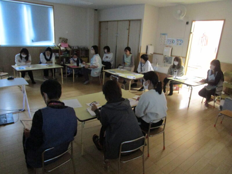 遊びや食事などの場面の事例では興味、関心、意欲が出るような工夫や配慮した保育なのか、不適切保育なのかなど話し合いました。また、講師から分かりやすく説明があり、短い言葉で、ゆっくり、穏やかに話し掛けるなど日常の保育に活かしていきたいと思います。